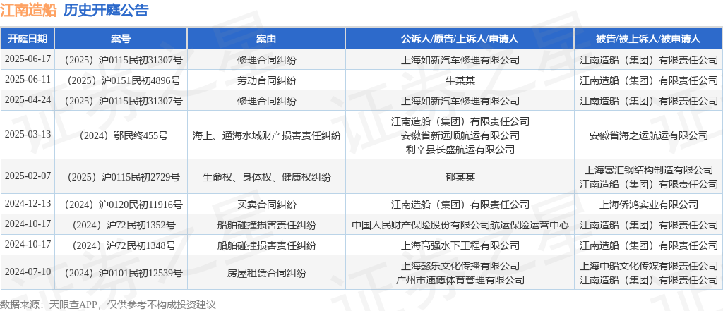 本站消息,根据天眼查APP显示,近日公布了一则江南造船(集团)有限责任公司作为被告/被上诉人的开庭公告,详细内容如下: